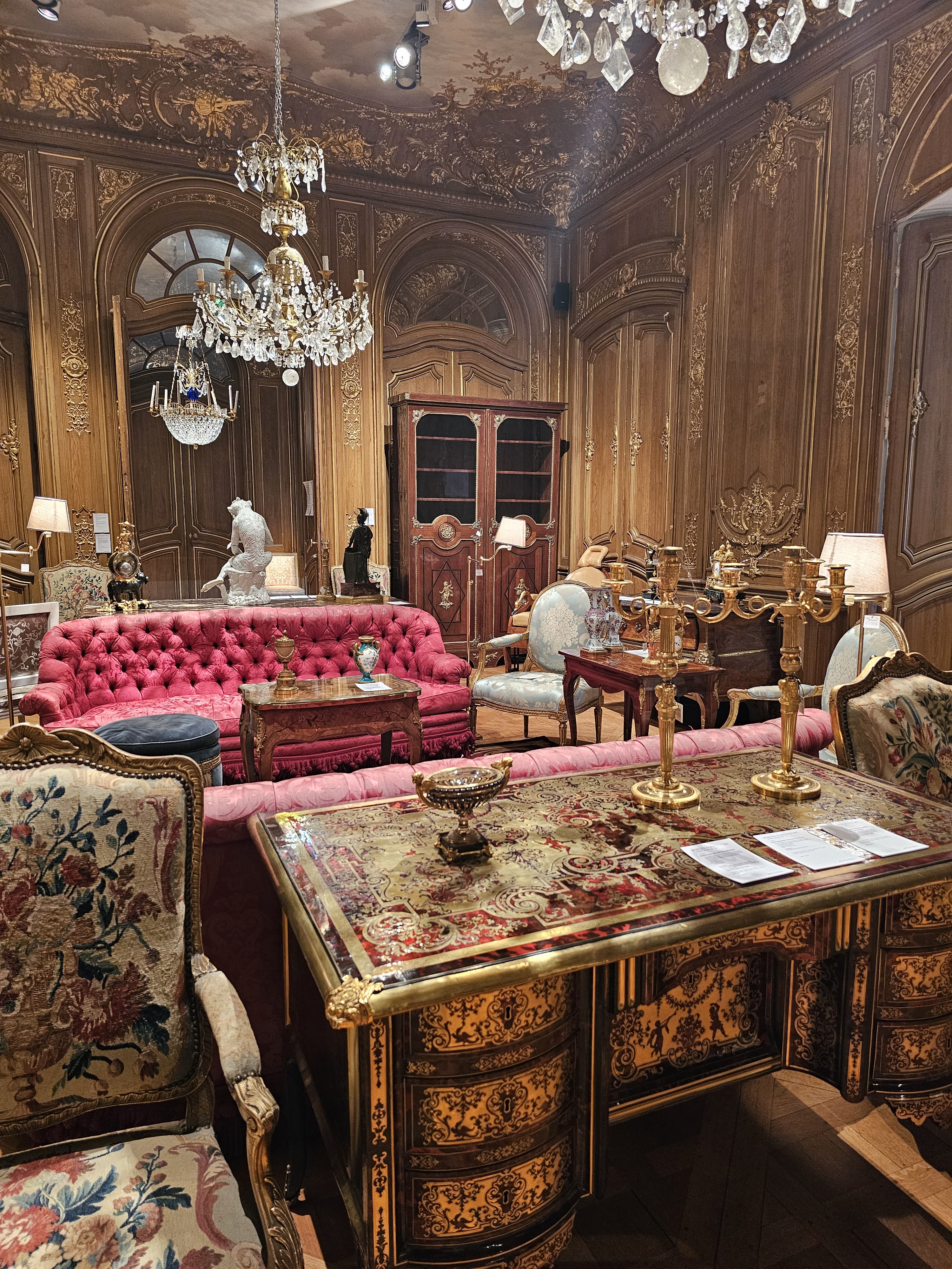 Maison Francaise se de ventes aux enchères d’objets d’art, situé à l’hôtel Marcel D’assaut à Paris. Ici exposition, compositions florales se mêlent aux tableaux . Un peu aseptisé